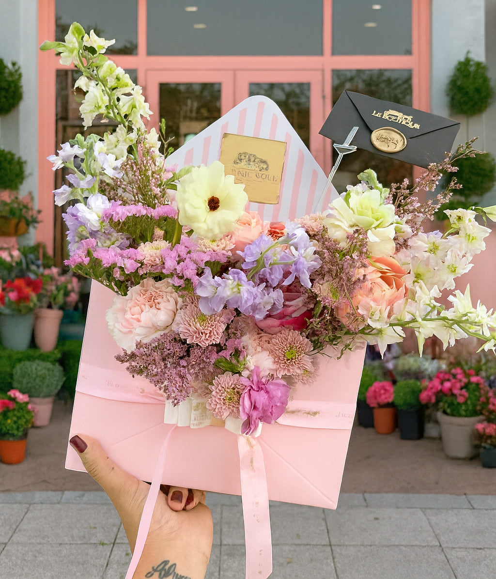 This arrangement is made with mixed seasonal flowers that was specially selected by our designer’s in a shaped envelope box, the perfect way to send a note for a special one.